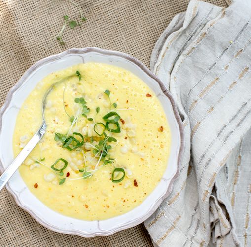 This bright yellow gazpacho uses yellow tomatoes, peppers, and corn to create intense flavor and color.  Once the corn is cooked, all you need to do is toss the ingredients in a blender.  Top it all off with some sliced avocado and a sprinkling of red pepper flakes for a beautiful and tasty contrast.
