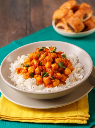 This chickpea curry is made up of canned, cooked chickpeas, onions, garlic and spices such as ground cloves, cumin, and dried and fresh cilantro. Try it - it's really delicious.