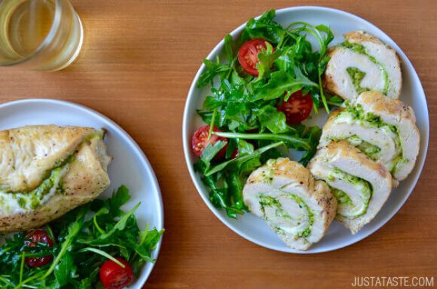 Chicken roulade is a fancy name for a seriously impressive dish that is shockingly easy to prepare.  Pound out a chicken breast until you have a large, thin piece.  Then layer on pesto (store-bought, to keep things simple) and mozzarella before rolling everything up and securing with a toothpick.  Sear the roulades on the stovetop before transfering the skillet to the oven for an extra delicious crust.  This recipe serves 4 but it's easy to scale down to a single roulade.