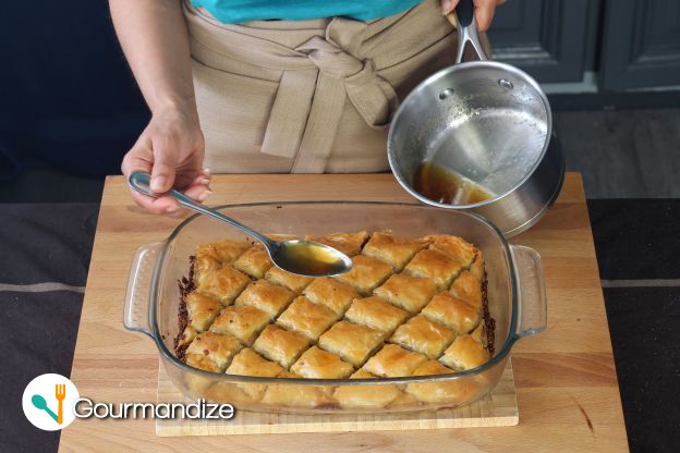 As soon as it's out of the oven pour the syrup onto the hot baklavas. Let cool completely before serving.