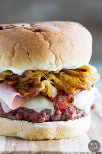 We know that hamburgers are not actually made of ham, but this recipe manages to get pork between the bread no less than three times! The patty is a mix of beef and pork, and is topped with slices of thick cut bacon and deli-sliced ham.  Now that's a real ham-burger!