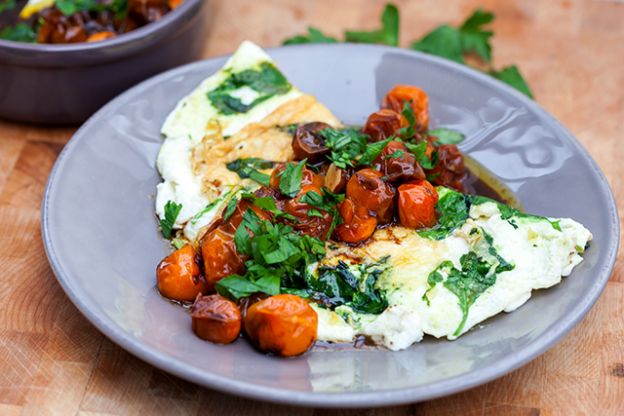 An simple way to lighten up your omelettes, frittatas, and scrambles is to embrace egg whites.  Yolks count for two thirds of the calories in an egg, so reducing the number in your recipes will drastically reduce the calorie count!  Try using a combination of whole eggs and egg whites or go full steam ahead and make an egg white-only omelette, like this flavorful one with spinach, feta, and roasted tomatoes.