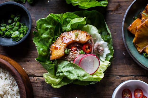 The best part of any taco, burrito, or fajita is definitely the filling, so why waste your calorie allowance on the carb-heavy wrapper?  Swapping in leaves of lettuce, chard, or kale is a colorful way to make taco night a little bit healthier.  We're pretty sure you'll be too busy savoring the spicy Korean pineapple and pork filling in this recipe to miss the tortillas!
