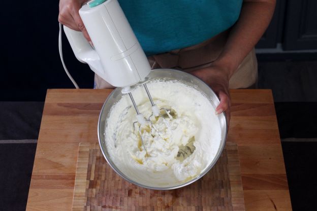 Beat the mascarpone with the cream it until you get a firm whipped cream mixture.