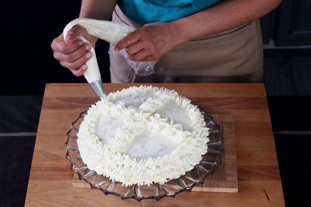 Add the remaining icing to a piping bag, and decorate the cake with ruffles, in three layers around the sides and in a "plus" or "X" shape across the top.