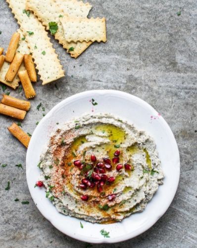 Baba Ganoush is a creamy eggplant puree. The eggplant is usually roasted, then blended with tahini (sesame cream), garlic, lemon juice and olive oil, which are common ingredients of Middle Eastern cuisine. It's best served with fluffy pita or lavash bread on the side, but crackers work well, too!