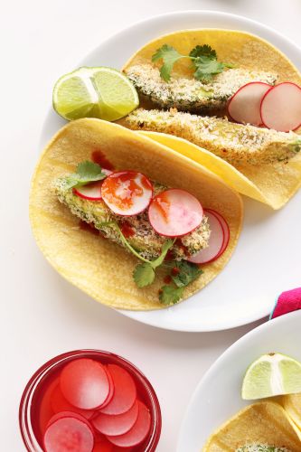 This taco recipe is full of fun new ideas, such as baking breaded avocado slices until crispy and tangy pickled radishes. Take it over the top by throwing in beans mixed with Sriracha. It's like nothing you've ever tried before.