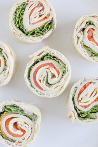 With a generous layer of cranberry cream cheese, these turkey roll ups are a delicious bite-sized snack perfect for any drinks party. Romaine lettuce and tomato add a healthy edge, but you could also leave them off to keep it simple.