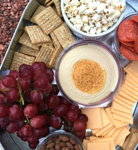 This eye-catching platter is a wonderful way to feed a crowd with next to no time in the kitchen. Simply lay out your ingredients (hummus, crackers, grapes, cheese, nuts, cold meats and popcorn, or a selection of these) in a pleasing display and your guests will be all smiles.