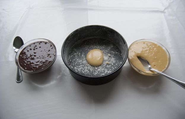 In the center of the mold, place a tablespoon of vanilla cake mix.