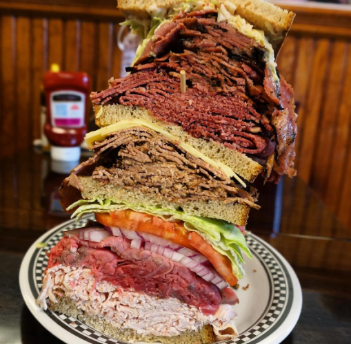 The Challenge: 6.5 lbs of corned beef, pastrami, turkey, roast beef and brisket + coleslaw + Russian dressing + Swiss cheese + lettuce, tomato and onion + sides of coleslaw, potato salad and 5 pickles in 55 minutes or less. Winners get their meal for free and their photo on the Wall of Fame. Losers pay 50 bucks for the colossal sandwich.