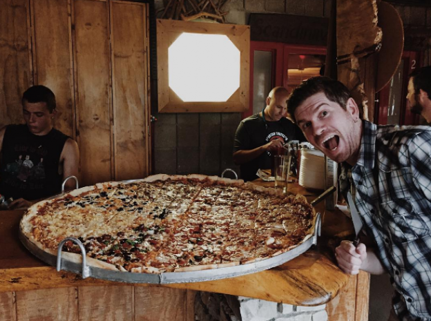The Challenge: 40" diameter, 15 lb. pizza loaded with toppings in one hour or less with 2 people. Winners get the $150 meal for free, $1000 in cash and their photo on the Wall of Fame.