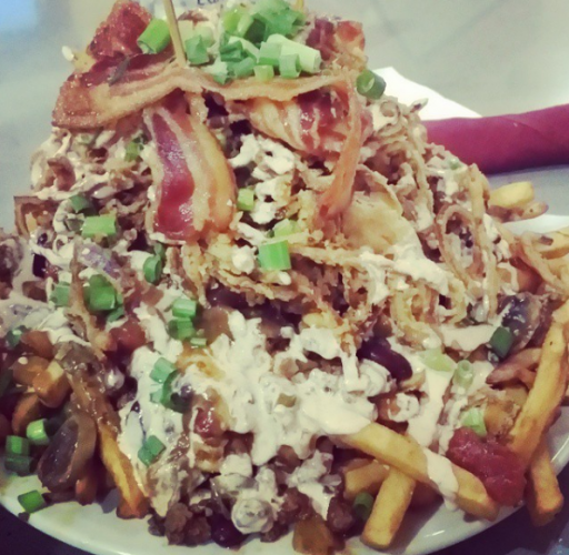 The Challenge: 2 grilled cheese sandwiches + 2 eight-ounce burger patties + cajun sauce + caramelized onions + crispy fried onions + meaty chili, served on a bed of fries (4.5 lbs. in total); no time limit but must be finished in one sitting. Winners get a free T-shirt. However, the $25 meal is not free.