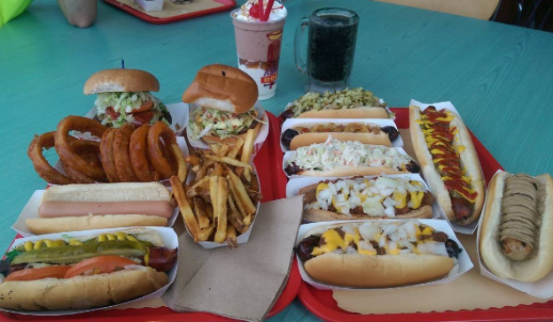 The Challenge: 9 loaded hot dogs + onion rings + fries + 2 burgers + sundae-milkshake + 1 mug of root beer in one hour or less. Winners get their $58 meal for free, a T-shirt and their photo on the Wall of Fame.