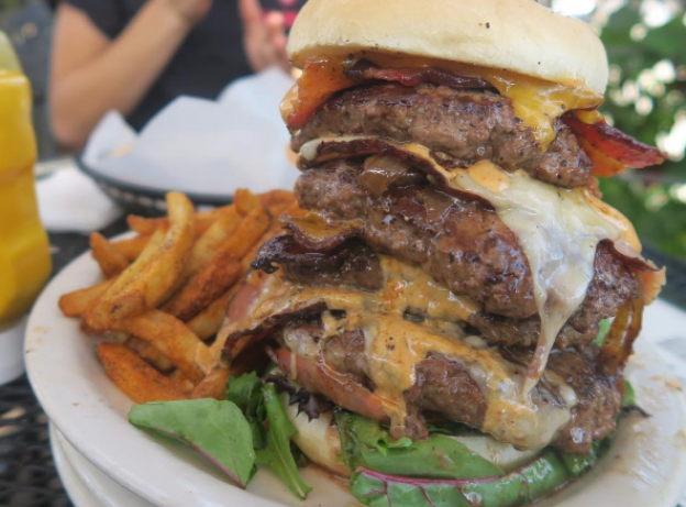The Challenge: 1-foot tall burger with bacon, ham, cheddar, swiss, caramelized onions, Lucky 13 sauce and 28 oz. fresh chuck + 14 oz. ground chuck burger with belizean habanero puree and roasted habaneros, stuffed between 2 grilled cheese sandwiches with caramelized onions roasted jalapenos and roasted habaneros in one hour or less. The 7-lb meal costs $36 if you lose. Winners get the meal for free, their photo on the Wall of Fame, $200 if they finish in less than one hour or $1000 if they break the previous record.