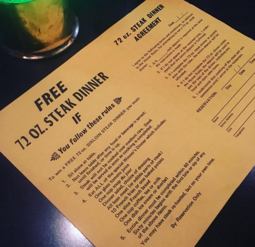 The Challenge: 72 oz. sirloin steak + 1 cup of soup + 1 dinner salad + 1 slice French bread + 10 french fries or 1 baked potato + 1 glass of tomato juice + 1 cup of tea, coffee or milk + 1 bowl of ice cream or sherbet in one hour or less. $75 must be paid in advance for the 6-lb. total meal, but it is reimbursed if you succeed in downing everything within the time limit.