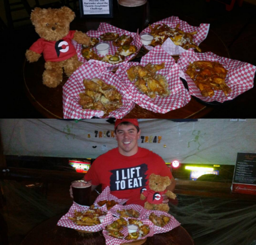 The Challenge: 24 wings + 1 order of bacon cheese fries + 6 BBQ pulled pork potato skins + 1 pitcher of beer + 1 shot of Fireball whiskey in 45 minutes or less. Winners get the $30 meal for free, a T-shirt, a photo on the Wall of Fame and a roll of toilet paper.
