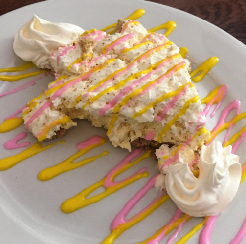 The pies at this rustic southern cafe in Bluffton are worthy competitors of your Grandma's best pies. Pictured here is the popular banana cream pie served with a few dollops of whipped cream and colorful, flavored glazes.