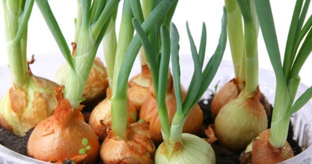 All you need to do to grow onions is to cut off a few inches of the onion bulb and plant it! Place it next to a window and water it regularly.
