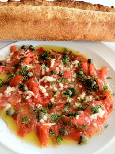 Salmon carpaccio is a healthy, easy no-cook dish that's ready in no-time. You can either cut thin slices of salmon from freshly caught fillets or use smoked salmon if you prefer. It's a totally refreshing summer meal that goes great atop crusty slices of baguette.