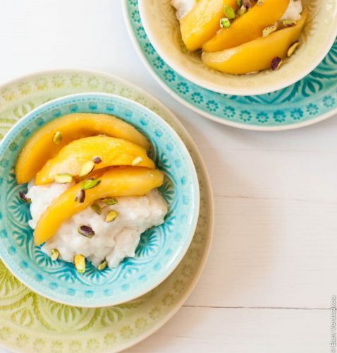 This coconut rice pudding with mangoes recipe is just the kind of light dessert that we love. Better yet— it's made in the crockpot! Mangoes and pistachio nuts make this classic pudding instantly summery, and it's totally vegan too.