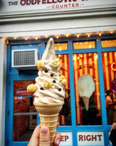 Oddfellows Ice Cream Co. in NYC is a highly popular family-owned-and-operated ice cream shop in Brooklyn. There, you can find imaginative offerings, such as this carnival-themed caramel popcorn flavor, made with salted caramel injection and topped with caramel corn and chocolate "pearls."