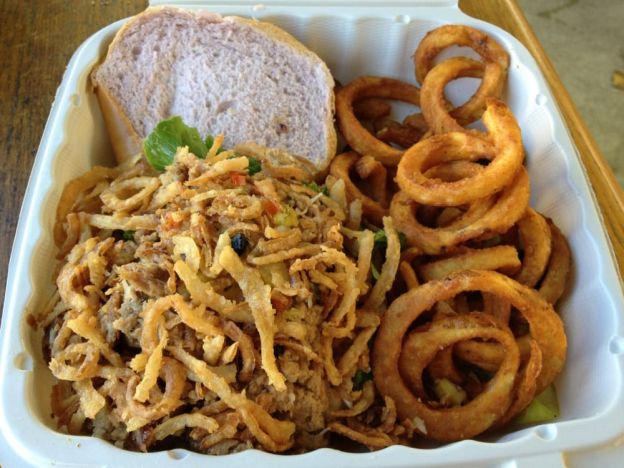 You can't leave Honolulu without trying Kaka'ako Kitchen's BBQ! This sandwich is an island favorite - kalua pork served on a taro bun and topped with coleslaw, pinapple salsa, and crispy fried onions.