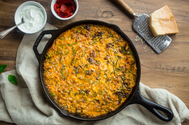 This healthy casserole is almost entirely made of veggies and the creamy, cheesy sauce that binds them all together is even made with non-fat Greek yogurt!  Healthy doesn't mean boring, however: it's packed with flavor, thanks to the garlic, artichoke hearts, fresh basil, and roasted red peppers tucked in between swirly strands of spiralized zucchini.