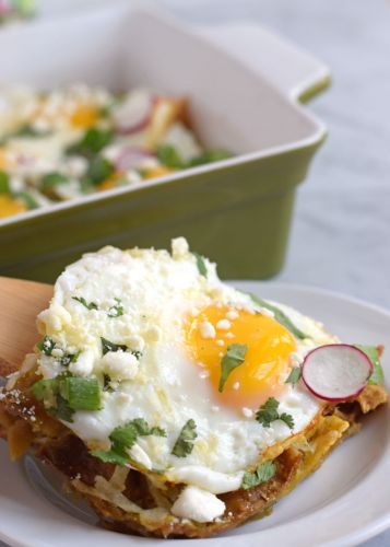 Here's another egg  casserole that is at high risk of becoming your next brunch favorite: Mexican chilaquiles. Cover a layer of corn tortilla chips with lots of salsa verde, cilantro, radishes, green onions and sunny side-up eggs, and you'll be in eggy heaven.