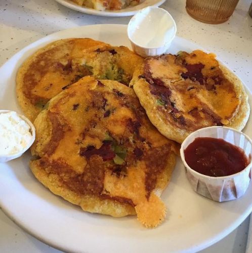 If you're more of a savory pancake person, then you must indulge in the Santa Fe Cornmeal Pancakes at this Nashville favorite. On your plate, you'll find three stone-ground cornmeal pancakes cooked up on the griddle with the addition of bacon, cheddar and roasted green chiles. Served with maple syrup, spicy salsa and sour cream, it's got the perfect blend of sweet and savory flavors to try.
