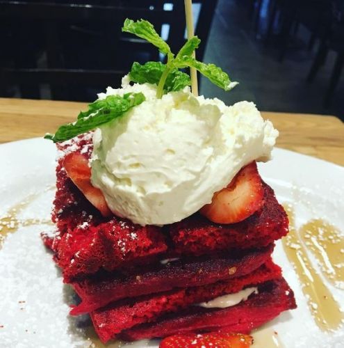 For a dazzling dish stacked high with luxurious red velvet pancakes, head to one of the three Green Eggs Café locations in Pennsylvania. The beautiful breakfast item is specked with morsels of chocolate, filled with layers of strawberry mascarpone and topped with maple syrup, whipped cream and fresh strawberries. Insert heart-eye emoji here.