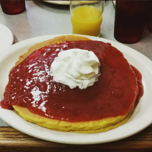 Featuring the best of the Midwest: the raspberry rhubarb pancake from the Grove Café in Iowa. We're not lying when we say that this is one gigantic flapjack — and it's completely smothered in sweet, succulent raspberry rhubarb sauce.