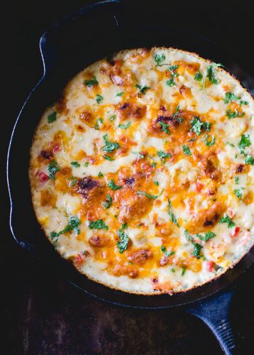 This irresistible cheesy chicken skillet dip is an easy way to get a bit of variety in your weeknight dinner roster and get your chicken fix in a festive way. Serve with sliced veggies, pitas, or crackers for dipping!