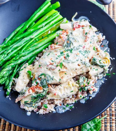Although it's served in a creamy sauce (a simply scrumptious creamy sauce, we might add), this chic chicken dish maintains a healthy feel thanks to the fresh flavors of baby spinach leaves, artichoke hearts and tart sun-dried tomatoes. Serve it with grated Parmesan and crispy green asparagus, and enjoy!