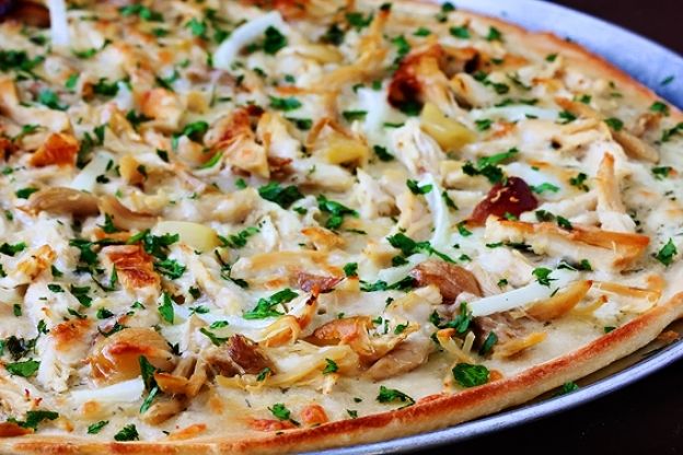 This incredible recipe sandwiches shredded chicken, sliced red onion, and creamy roasted garlic between two kinds of cheese and spreads it all on a store-bought pizza crust. An original pizza that's loaded with flavor!