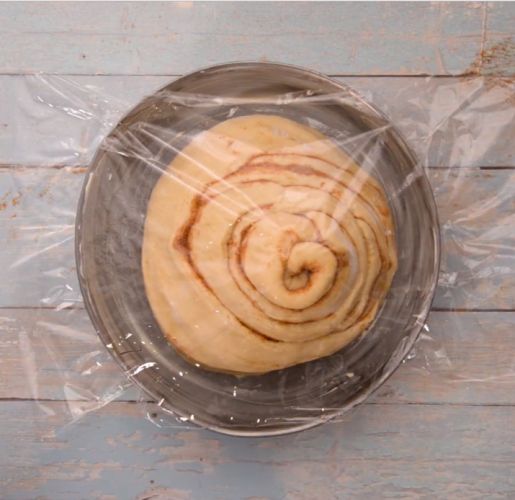 Place the giant cinnamon roll in a greased pan and cover with plastic wrap. Place in a warm place and let it stand for 30 minutes for the dough to rise. At that time, the roll should expand to fill out the pan.