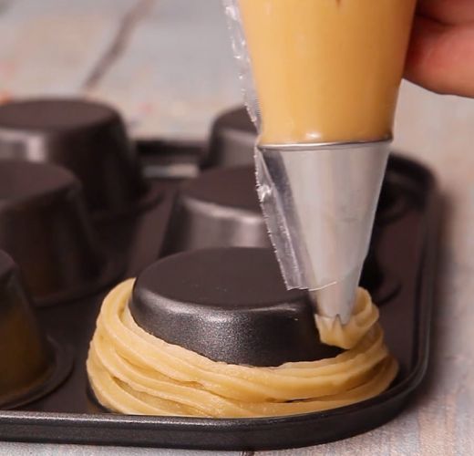 Meanwhile, grease the underside of a cupcake pan, and serve dough with the sleeve around each cupcake space, going from bottom to top, and from the sides to center to form a kind of dome.