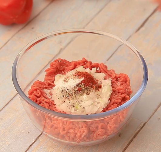 In a bowl, mix the ground meat with one of the onions (finely chopped), and season with salt, pepper, paprika and oregano.