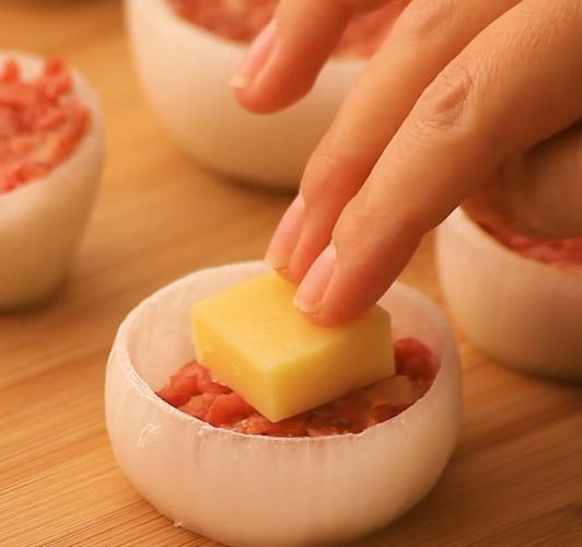 Fill each ring with a layer of ground beef, and a cube of cheese.