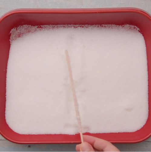 To start, place some water into a deep dish and dip the skewers into the water. Then roll the skewers in another dish filled with about 1 cup of sugar. Make sure that the sugar coats every side of each skewers.