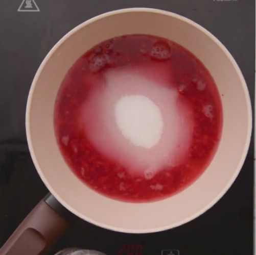 Once you have crushed the raspberries, pour into a pot over medium heat. Add 3 cups of water and 3 cups of sugar. Mix until the sugar dissolves completely.