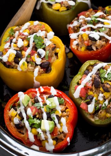For this no-brainer recipe, stuff lovely colorful bell peppers with uncooked ground meat, black beans, corn, enchilada sauce and cheese, and season with chili powder and cumin, then put them in the crockpot and let it get to work. Top with a bit of lime juice, sour cream and avocado and you're in business!