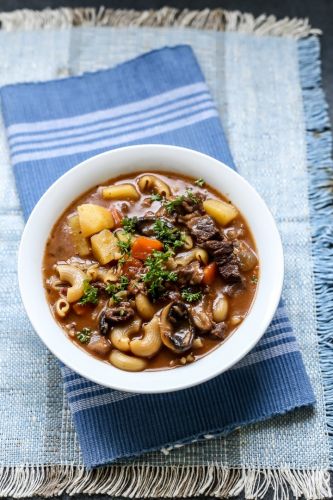 Tender and stodgy, this stew will warm your soul. Bite-sized cuts of beef, carrots, mushrooms, and potatoes simmer together in a steaming broth (with a cup of red wine for added flavor). Recipe here.