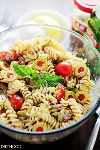Not all pasta salads must be coated in mayo or Ranch dressing to be delicious, and here's another light and tasty recipe that proves it. The lemon-garlic vinaigrette goes perfectly with the chunk light tuna and pimiento-stuffed olives, with little need for much else besides cherry tomatoes and fresh basil to garnish.
