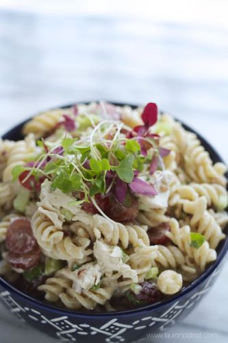 If you feel like your chicken salad is missing something, it's probably carbs. This recipe takes care of that by combining classic chicken salad ingredients, such as red onion, celery, grapes, pecans, cubed chicken and parsley, with a creamy, herbed mayonnaise mixture and rotini pasta. 30 minutes, and your picnic salad is ready!
