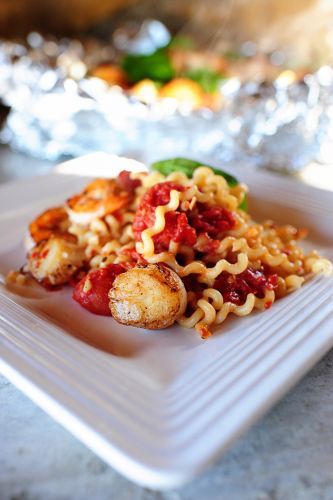 This versatile seafood pasta recipe is perfect for those nights when you can't decide between scallops and shrimp or between artichokes and olives. Sear your seafood of choice on the stovetop, add in whatever veggies you have on hand, then wrap it all up in aluminum foil along with some cooked pasta to bake in the oven.