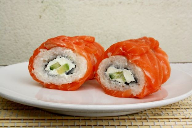 Everybody deserves hugs, and there is nothing quite like a fresh salmony embrace to make rice feel special. Throw in some avocado and cream cheese and you have this winning sushi roll combination