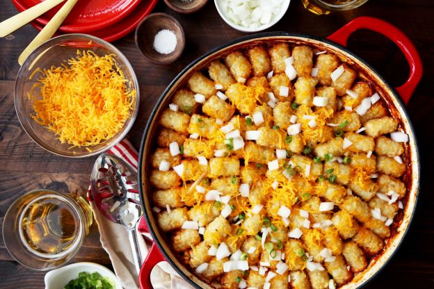 Chili cheese dogs are reimagined as a casserole in this recipe. With a cheesy tater tot topping, this dish blends textures and flavors with a balanced hand for a tasty experience unlike anything else.