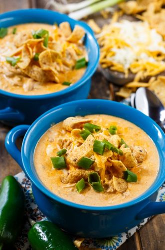 Here's a rich and creamy crockpot chicken chili recipe with southwestern flair. It's got three types of cheese (cream cheese, cheddar and monterey jack) plus plenty of flavor from diced green chiles, fresh jalapeno and a packet of taco seasoning. Garnish with green onions and frito chips to serve.