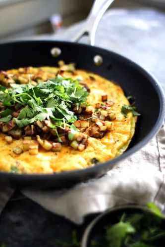 Add a kick of heat to your brunch menu with this recipe. Jalapenos and other peppers are sprinkled throughout this cheesy frittata inspired by the game day favorite—jalapeno poppers. Filled with cheddar and cream cheese, and sprinkled with crispy potatoes, this dish is sure to be a crowd-pleaser.